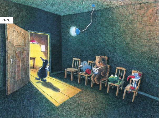 Vier ramponierte Spielzeugtiere und ein Pinocchio mit gebrochener Nase sitzen besorgt beim Arzt im Wartezimmer. Eines nach dem anderen verschwindet hinter seiner Tür. Obwohl alle repariert, gesund und gut gelaunt wieder herauskommen, wächst die Sorge bei denen, die noch warten. Ein Buch über die Angst, an die Reihe zu kommen.