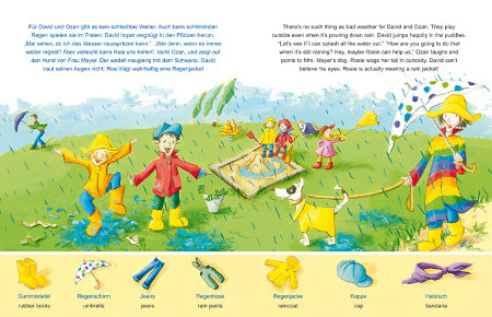 Was ziehen wir heute an? thematisiert, welche Kleidungsstücke eine Familie fur einen typischen Apriltag braucht. Besonders anschaulich: Die Wort-Bild-Leiste auf jeder Seite greift wichtige Gegenstände erneut auf und fördert gezielt das Suchen, Finden und Benennen.