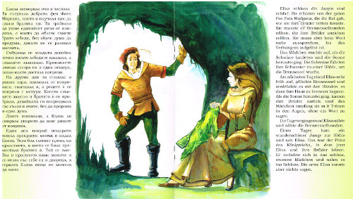 "Die wilden Schwäne" als zweisprachiges Kinderbuch aus Bulgarien. In dieser Serie sind insgesamt 8 Titel erschienen. Der Text wird parallel wiedergegeben auf der einen Seite in Bulgarisch auf der gegenüberliegenden Seite in Deutsch.