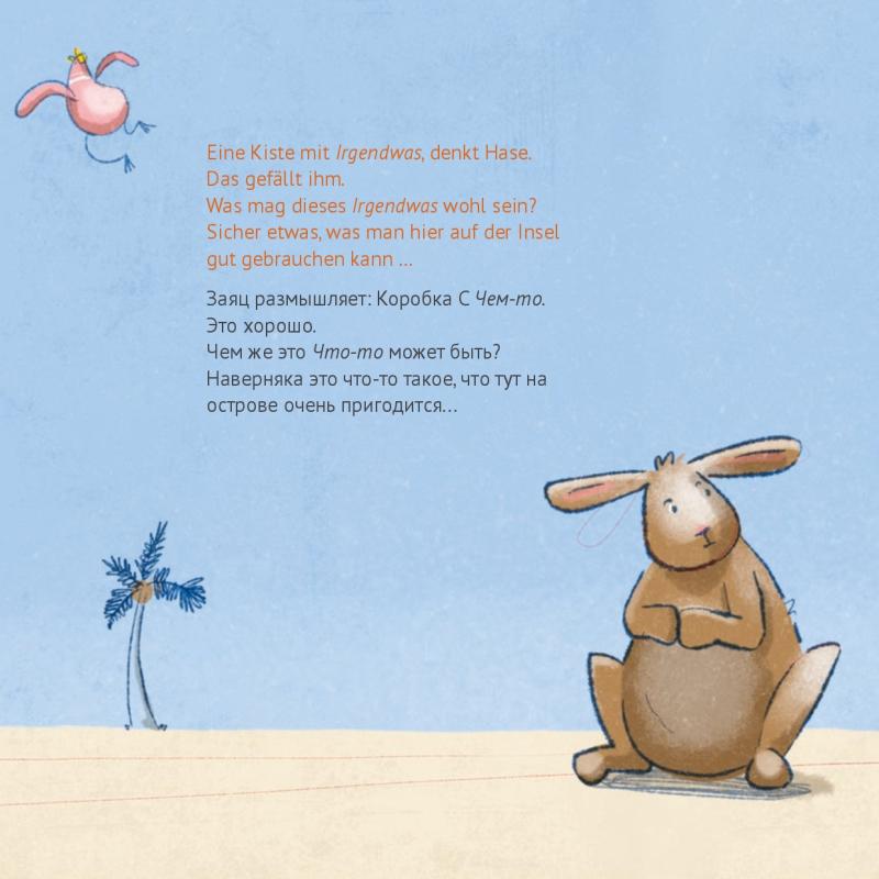 Eine neue Geschichte von Hase und Huhn: Huhn hat Irgendwas in einer großen Kiste bestellt und Hase grübelt, was es sein könnte. Ist es etwas, was sie gut gebrauchen können?