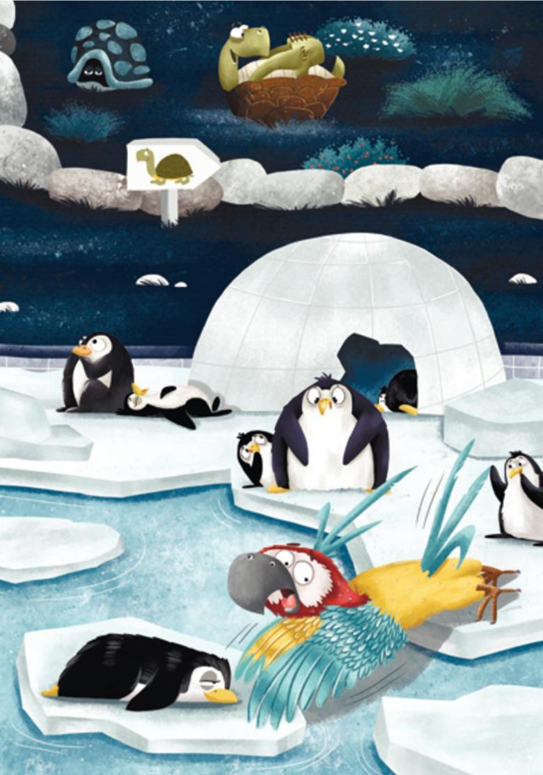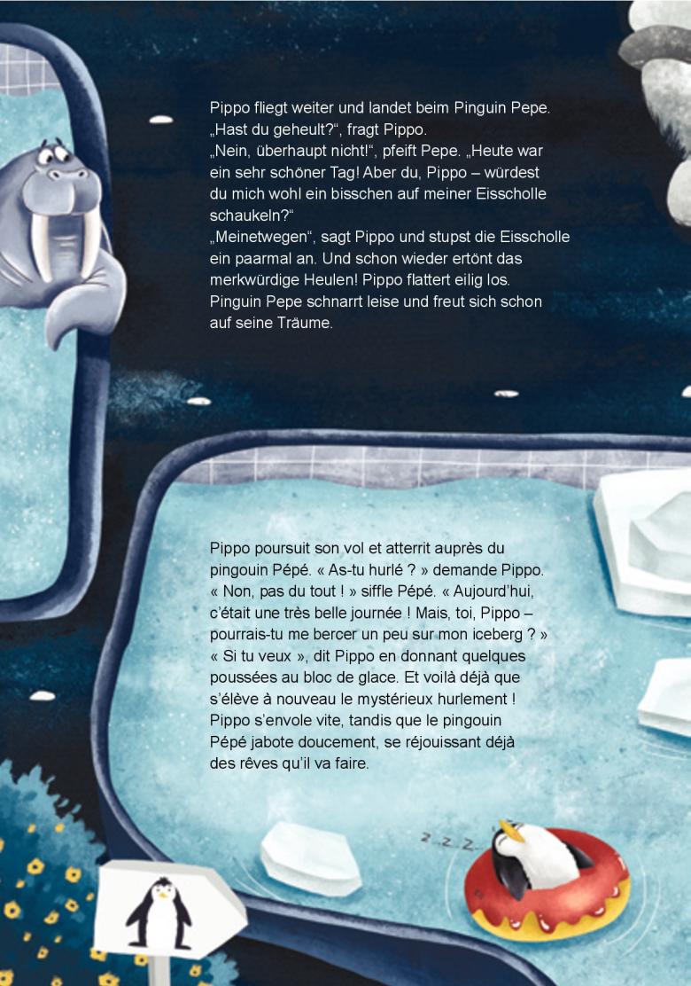 La nuit tombe sur le zoo, mais Pippo le perroquet ne peut pas s’endormir. Quel est ce hurlement ? Pippo vole d’un enclos à l’autre pour trouver l’origine du bruit et se donne ainsi l’occasion d’aider de nombreux animaux à se préparer à dormir. Et quel est l’énergumène qui hurle ainsi ? Il finit par le trouver !