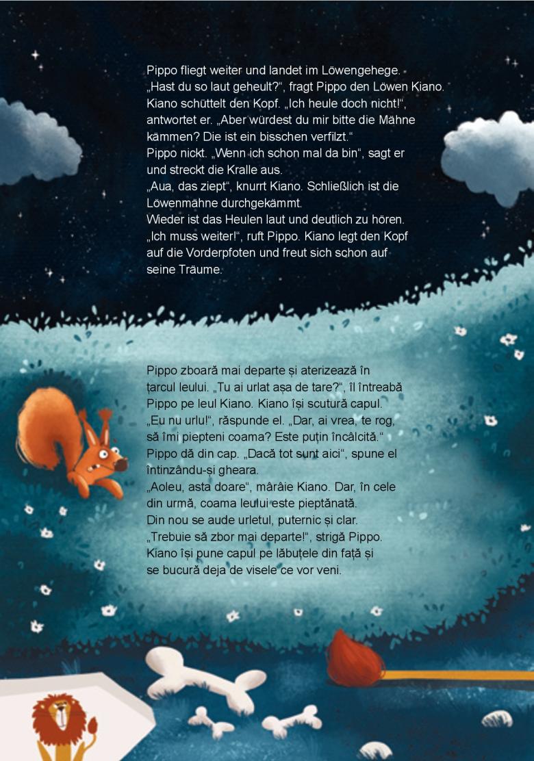 Es wird Nacht im Zoo, doch Papagei Pippo kann nicht einschlafen. Wer heult da nur? Pippo fliegt durch die Gehege, um den Ursprung des Lärms zu finden und kann so manchem Tier dabei helfen, sich fürs Bett vorzubereiten. Und wer da so heult? Das findet er auch heraus!