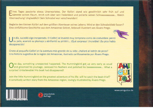 Drei Sprachen in einem Buch, Debütroman von José Paniagua!!! Begleitet den kleinen Kolibri auf seinem größten Abenteuer. Eines Morgens ist sein Schnabel verschwunden. Der Kolibri macht sich auf die Suche nach dem Schnabeldieb. Für Kinder ab 4 Jahre geeignet.