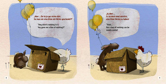 Das Huhn freut sich, denn es bekommt vom Hasen eine Kiste zum Geburtstag. Doch - nanu? Da ist ja gar nichts drin!