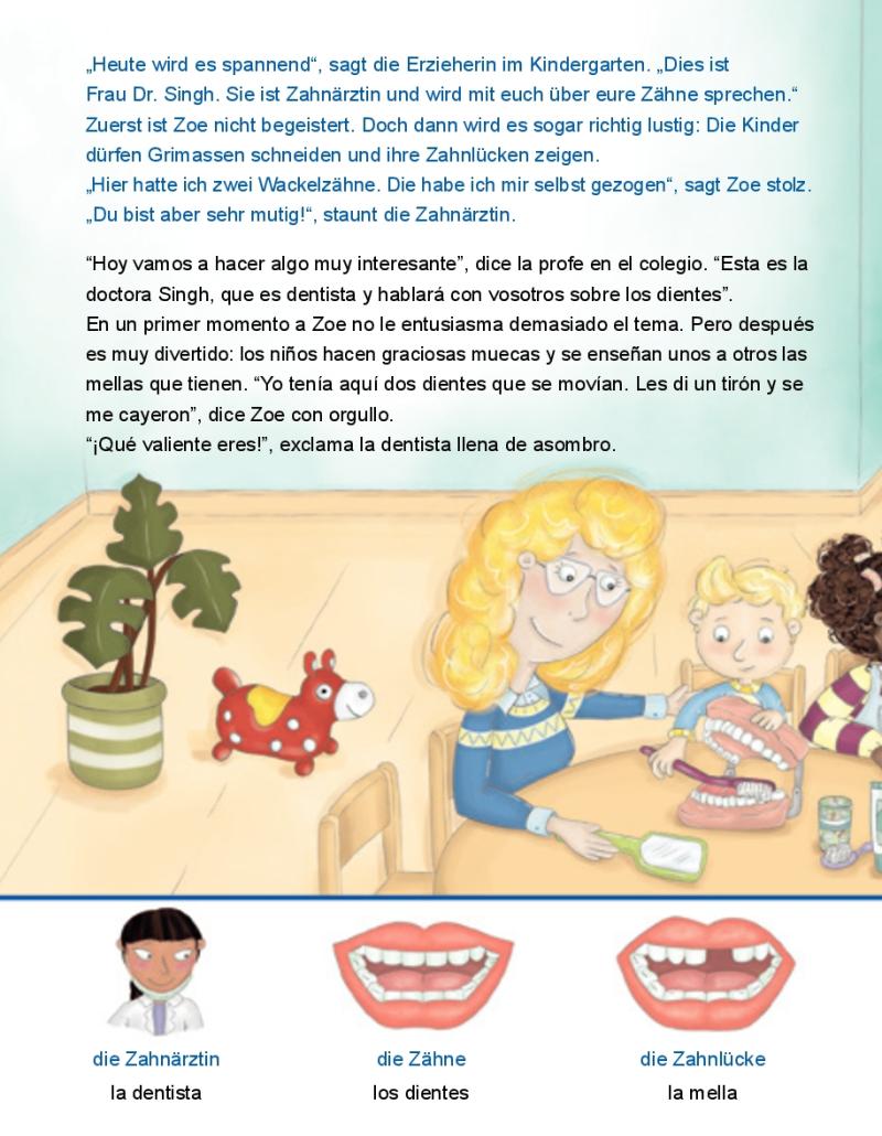 Beim Zahnarzt ist der 20. Band der Reihe bilibrini – die kleinen Zweisprachigen, der sich mit dem Themenbereich rund um Zahnarztbesuche beschäftigt. Das Buch ist ideal für den ersten Einstieg in eine weitere Sprache. Die Wort-Bild-Leiste auf jeder Seite greift einzelne Motive auf und fördert gezielt das Suchen, Finden und Benennen.
